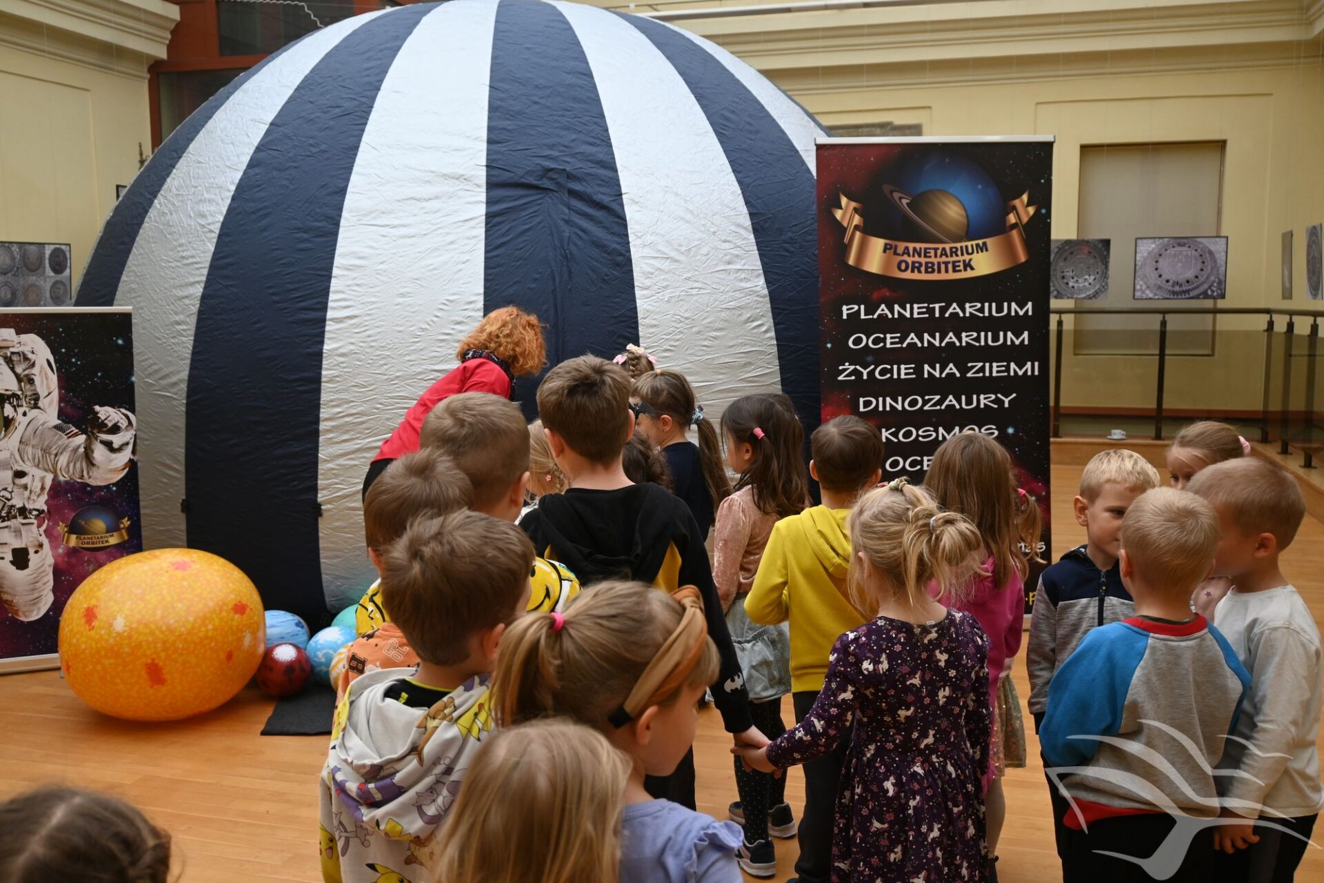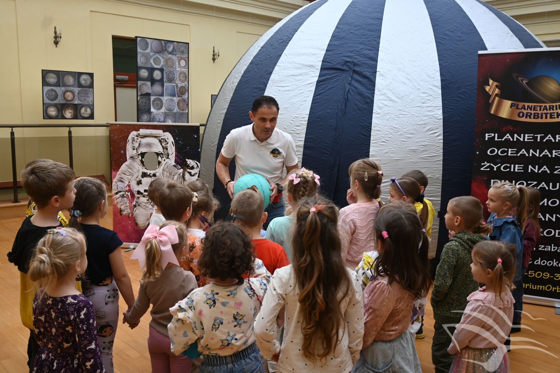 W dniu 30 września w naszej bibliotece odbyły się podwójne warsztaty dla dzieci w mobilnym planetarium. Uczestnicy mieli okazję przenieść się w kosmiczną podróż i poznać tajemnice Układu Słonecznego, gwiazd i planet. Dzieci dowiedziały się m.in. jak powstają gwiazdy, czym różnią się planety oraz jakie zjawiska można obserwować na nocnym niebie.