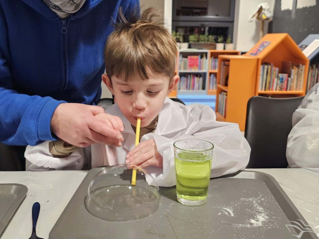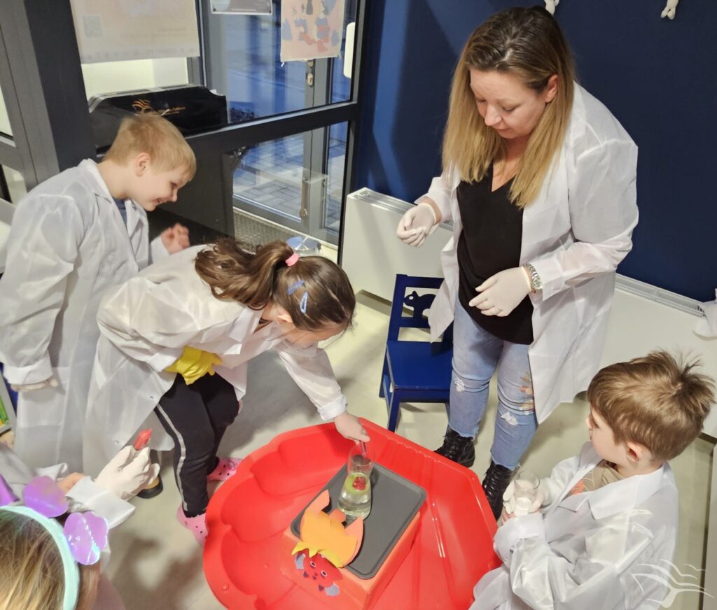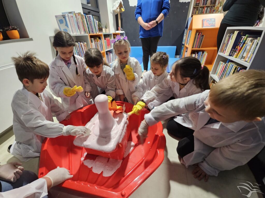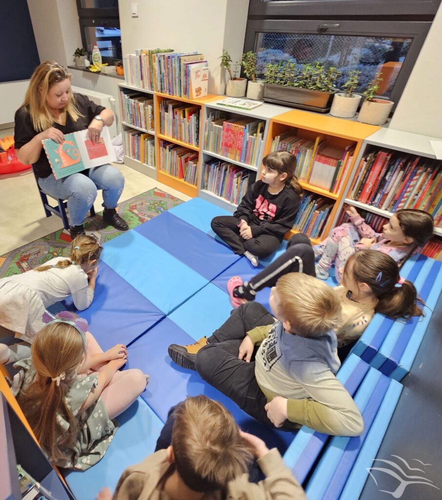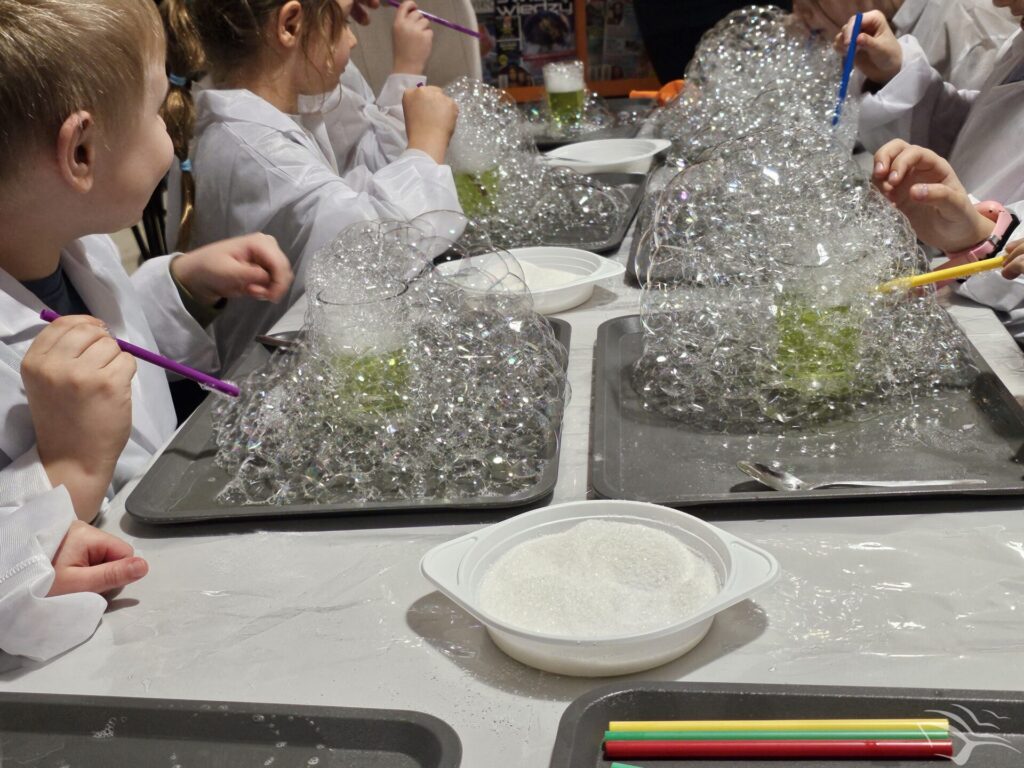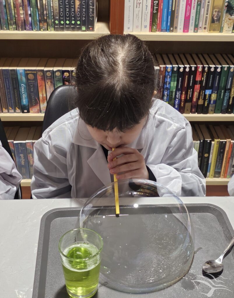 Podczas ostatniego spotkania dzieci przenieśliśmy się do świata książeczki „Jak wychować smoka”. Wspólne słuchanie opowieści było punktem wyjścia do rozmowy i zabawy inspirowanej historią. Następnie dzieci wzięły udział w prostych doświadczeniach nawiązujących do smoczego bohatera – obserwowały jego „ognisty” temperament, sprawdzały, jak potrafi dmuchać, a na zakończenie stworzyły lekkie, mydlane bańki.