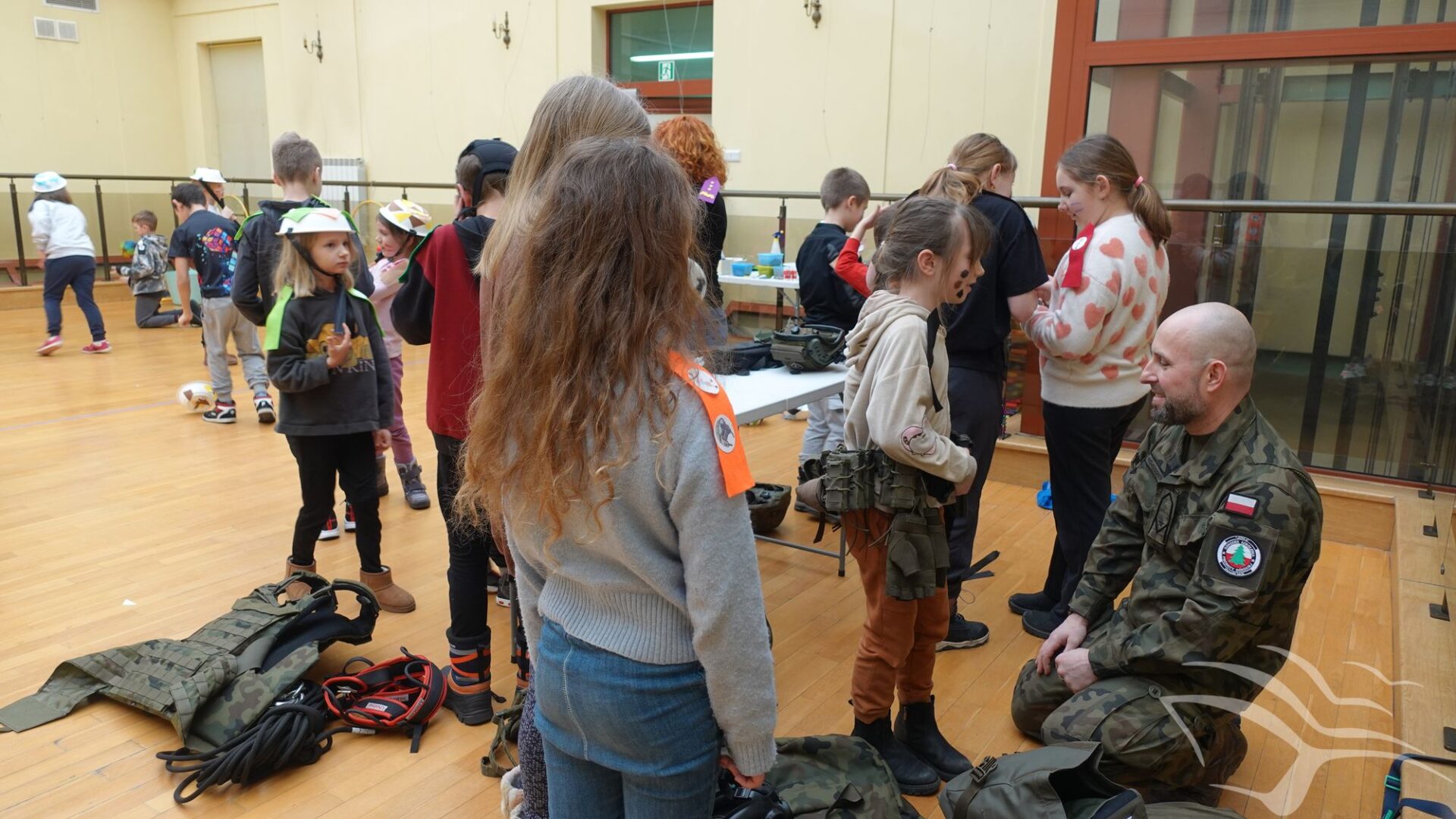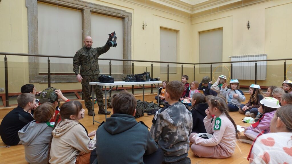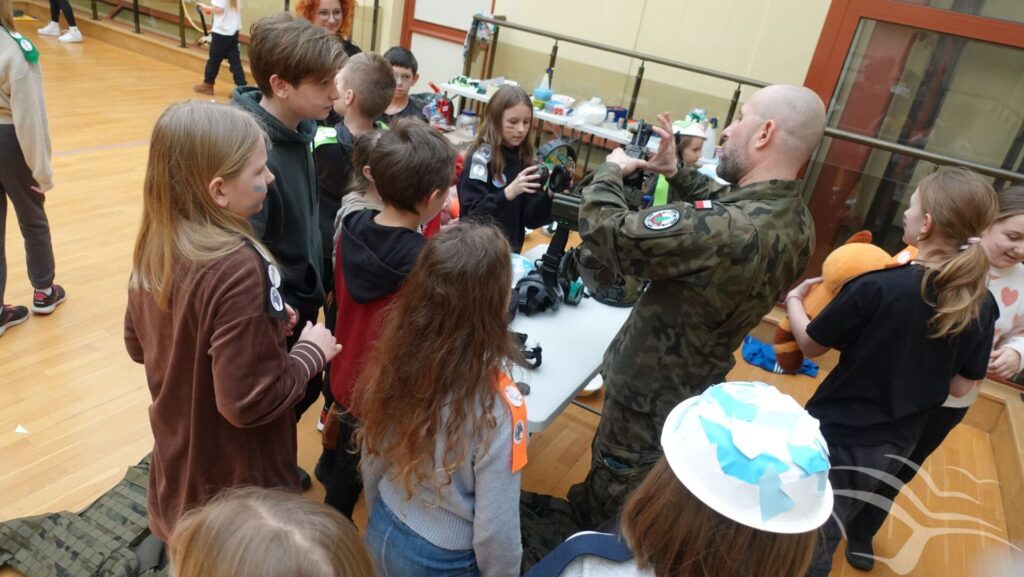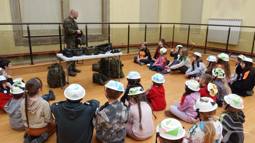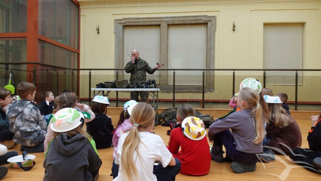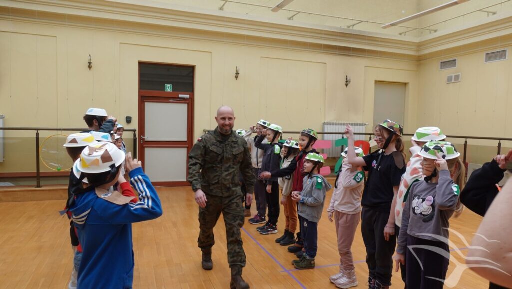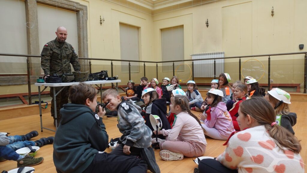 Zawód nie z tej Ziemi… na pierwszy ogień poszedł żołnierz! We własnoręcznie przygotowanym rynsztunku odebraliśmy lekcję musztry, było trochę ruchu i dużo śmiechu, bo nie każdemu „baczność” wychodziła idealnie. A nasz gość specjalny – młodszy chorąży Dawid Wojciechowski z Ośrodka Szkolenia Piechoty w Dusznikach Zdrój, pokazał, że zawód żołnierza to nie tylko „padnij–powstań”, ale też spryt, odwaga i sporo umiejętności.