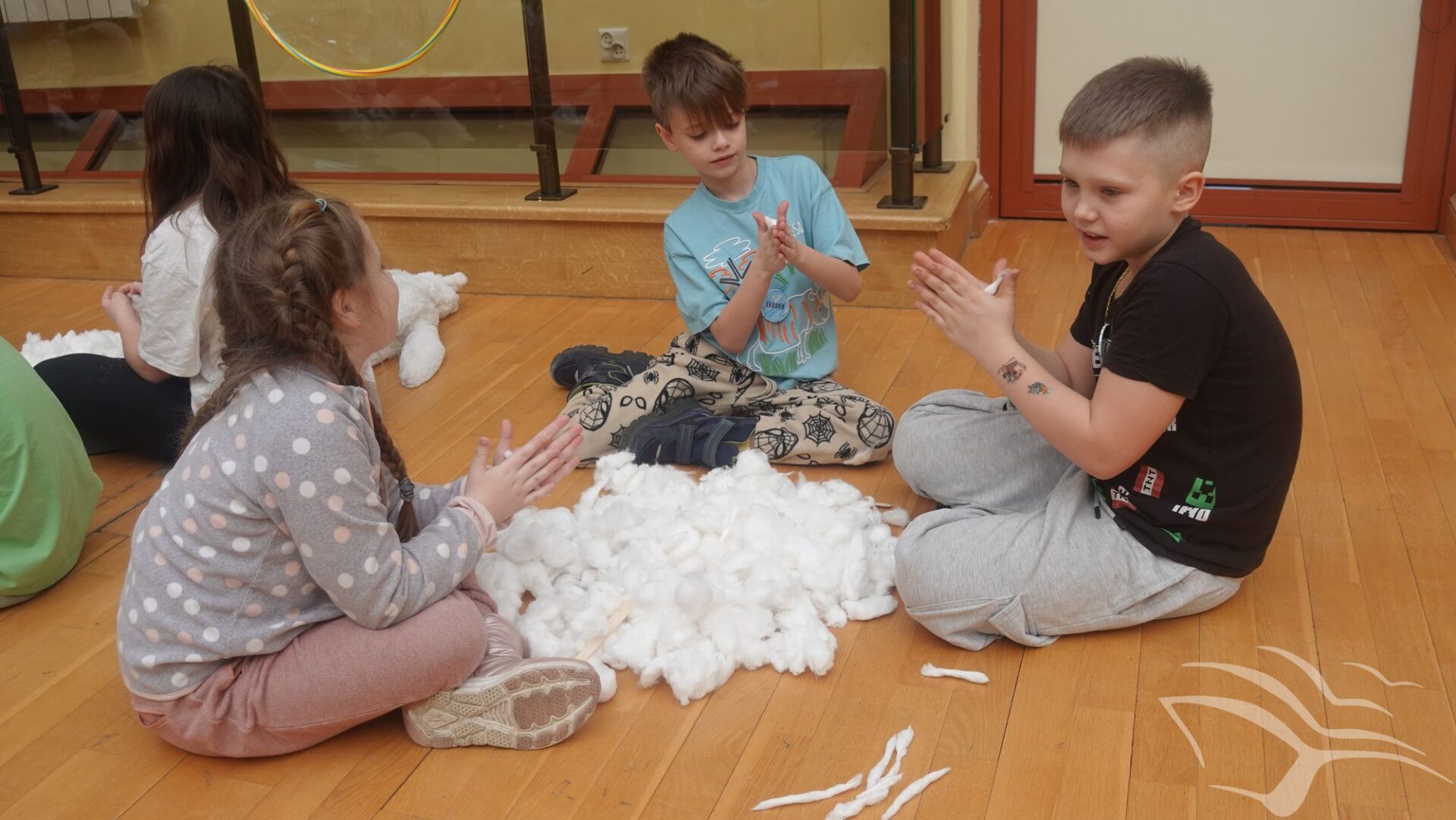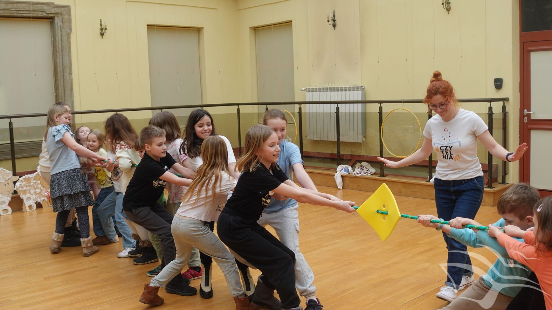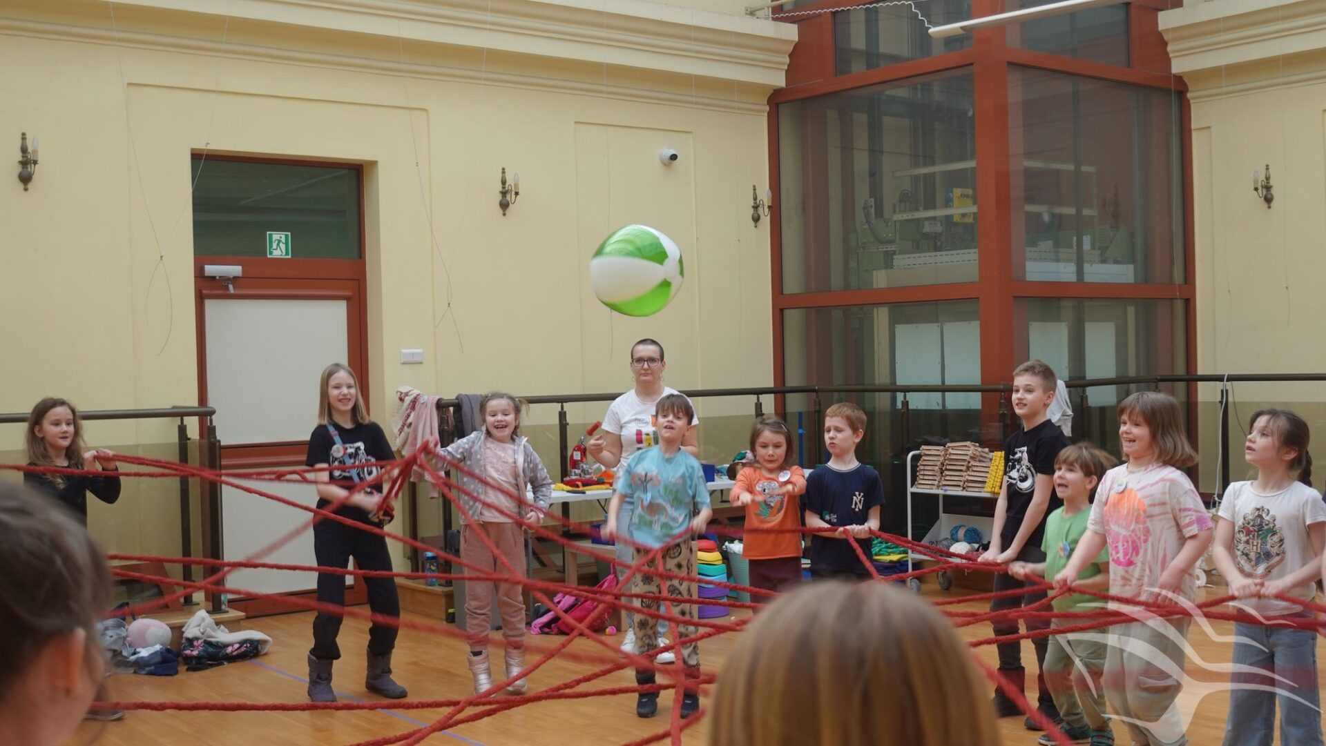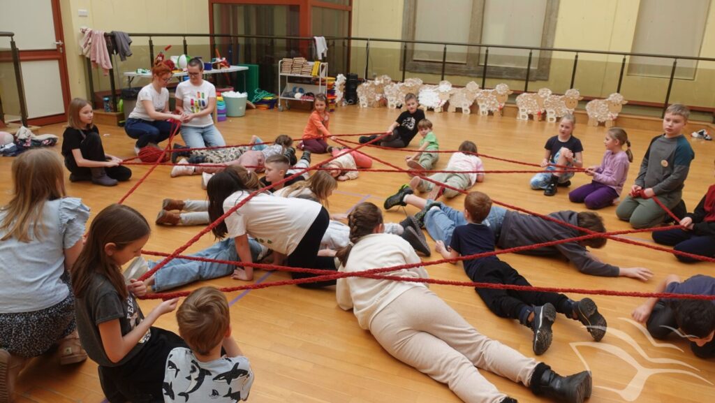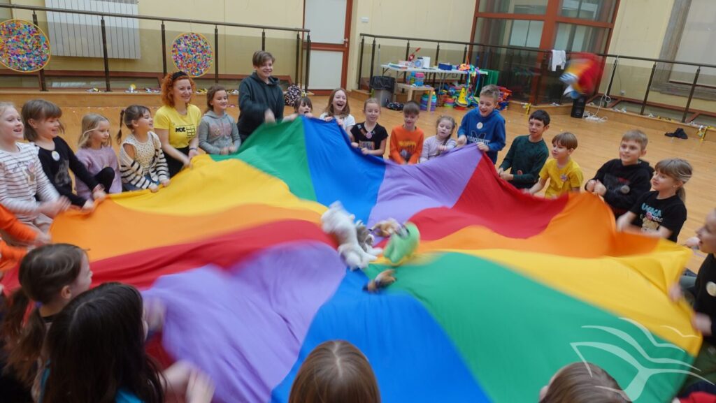 Zawód nie z tej Ziemi… zrobiło się wyjątkowo kolorowo i pachnąco, bo tematem dnia był zawód florysta. Powstawały tiulowe, serduszkowe wianki – było trochę plątania, trochę wiązania i całkiem sporo radosnych okrzyków. Za pomocą chusty, szarf i pyłku wyczarowaliśmy kolorową łąkę.