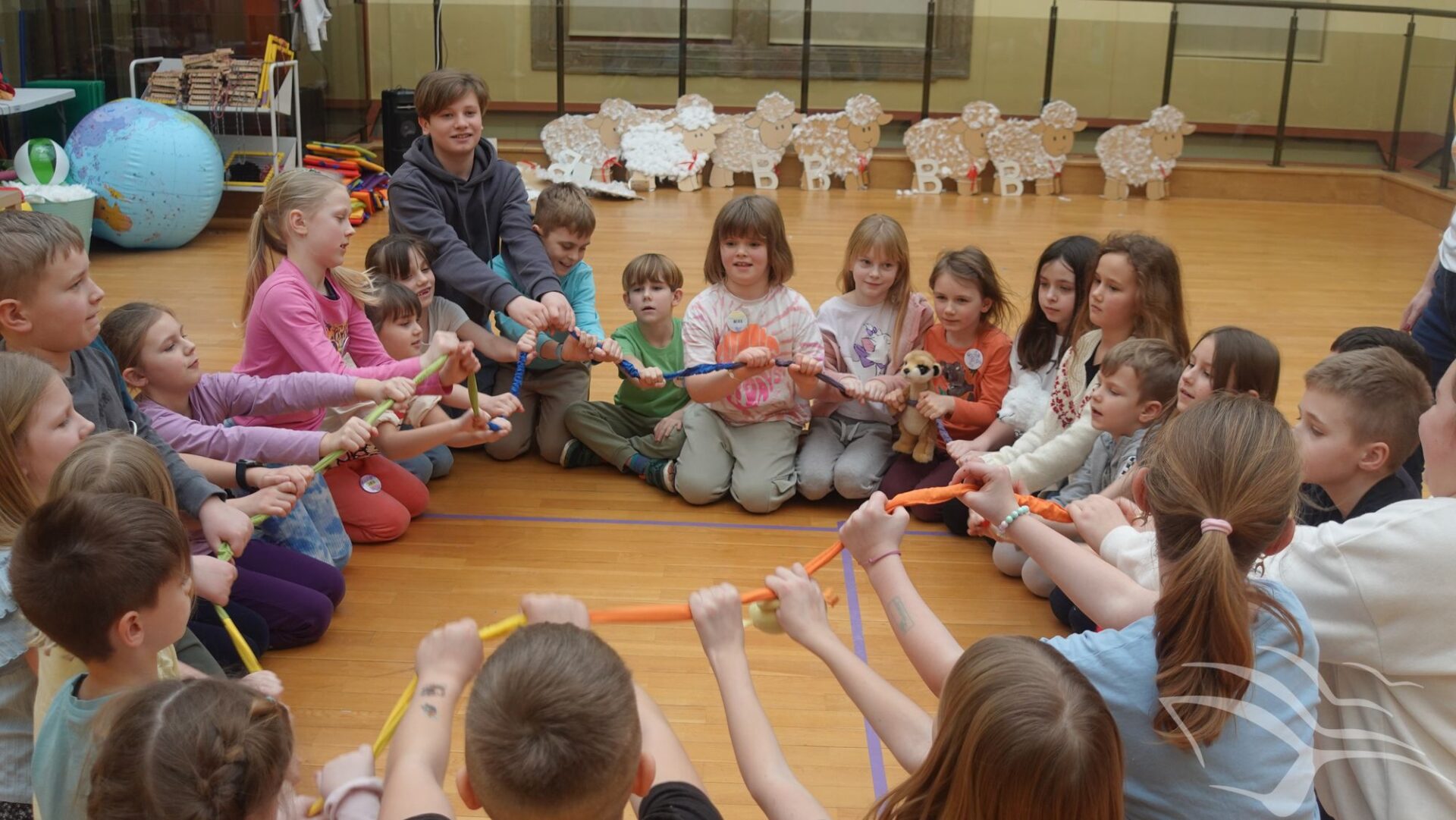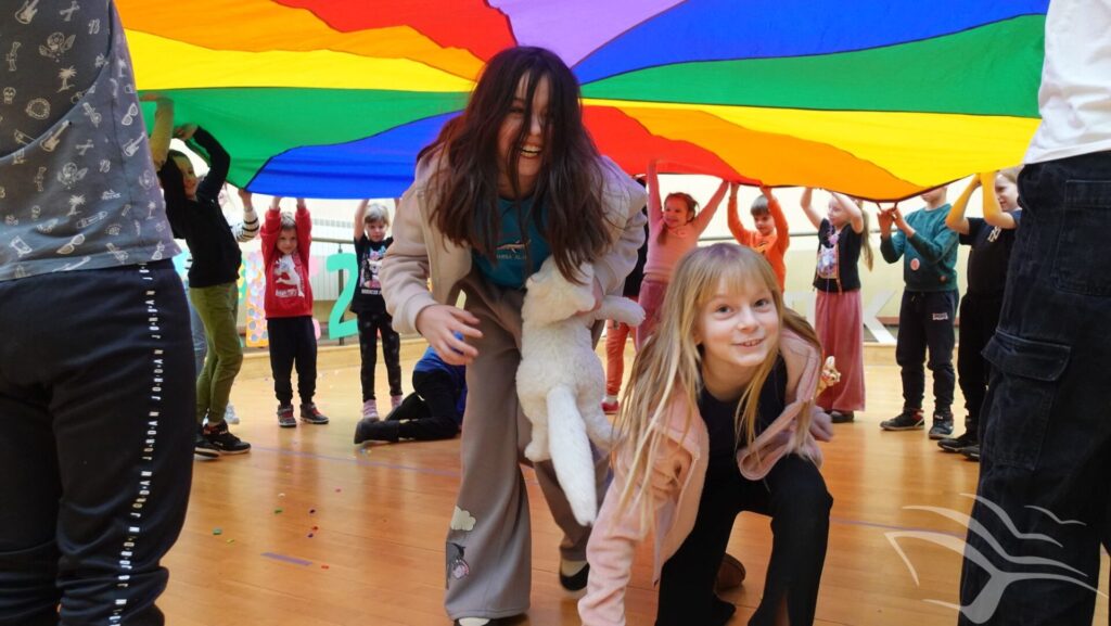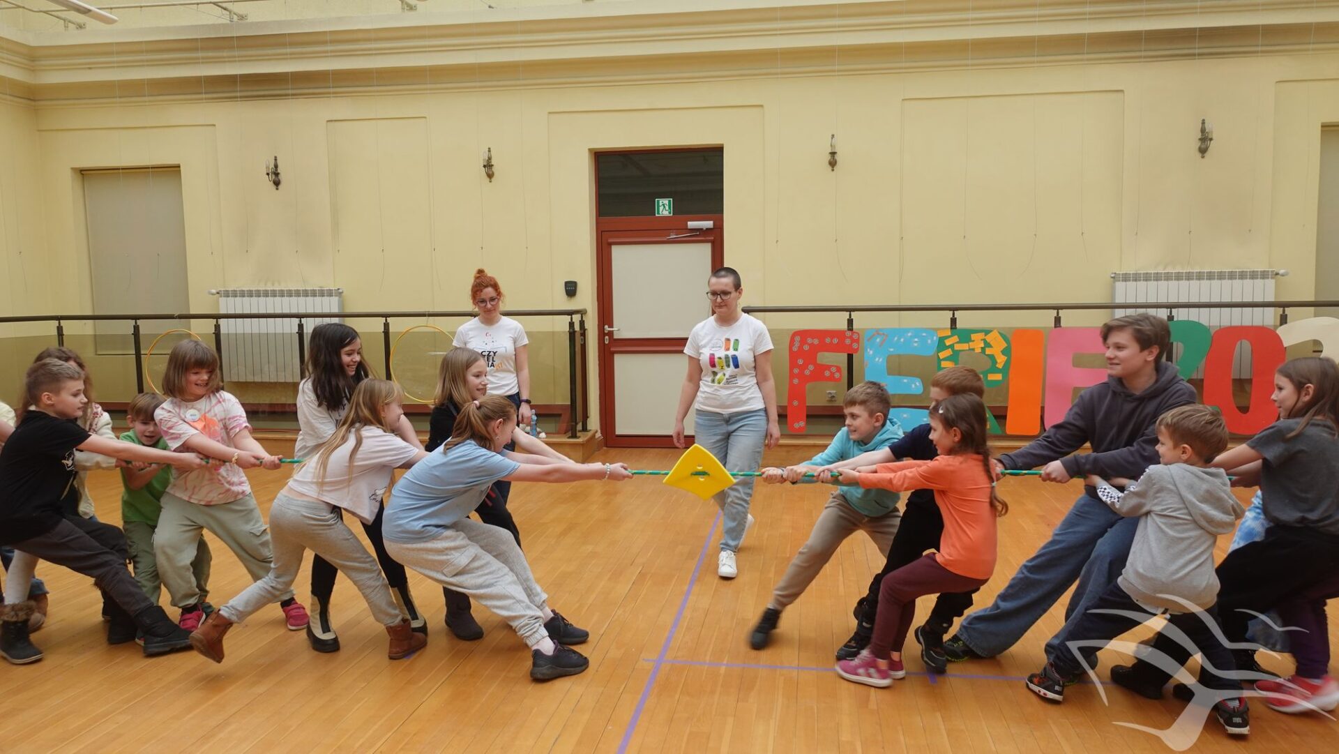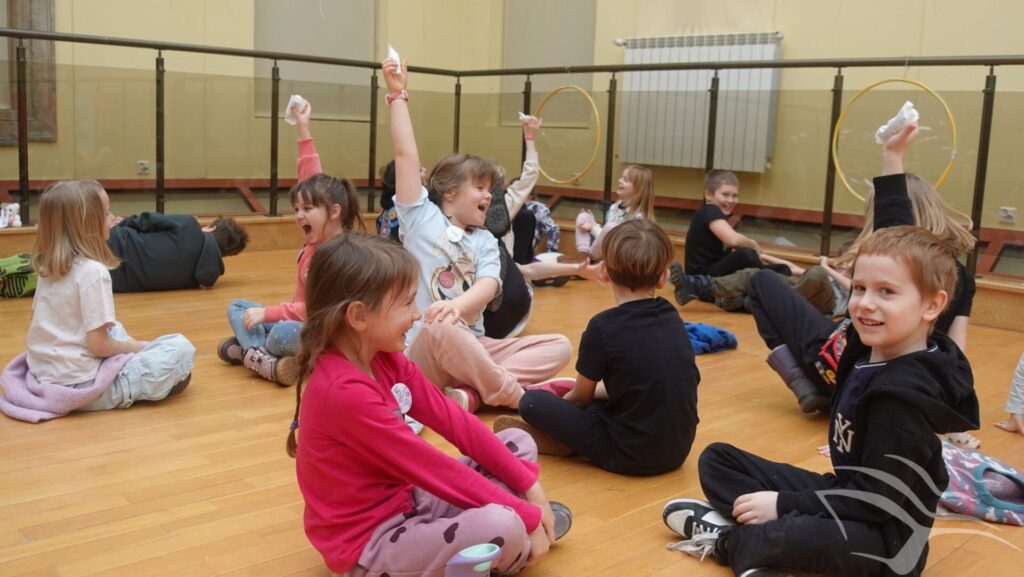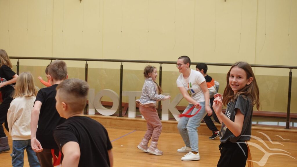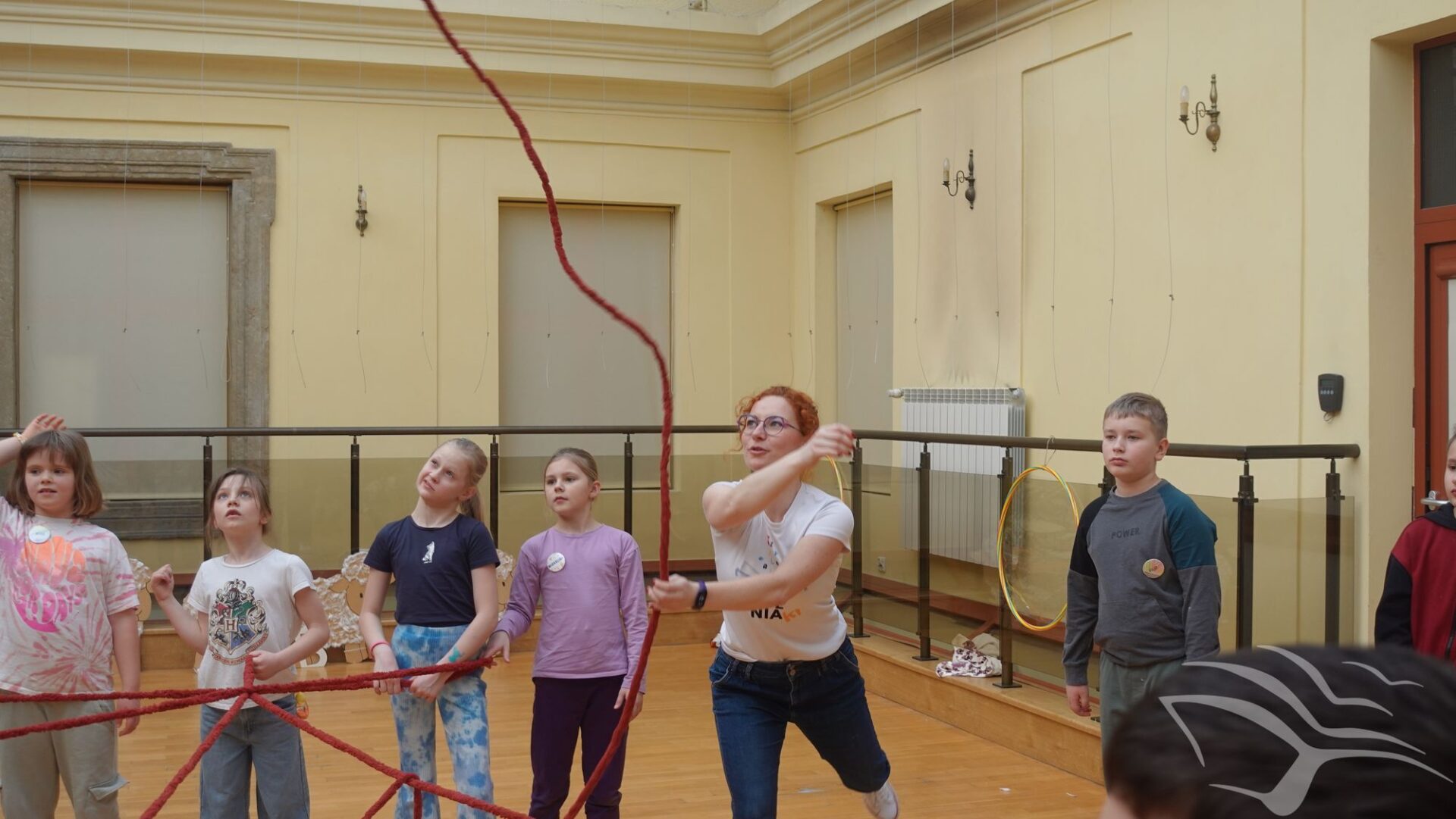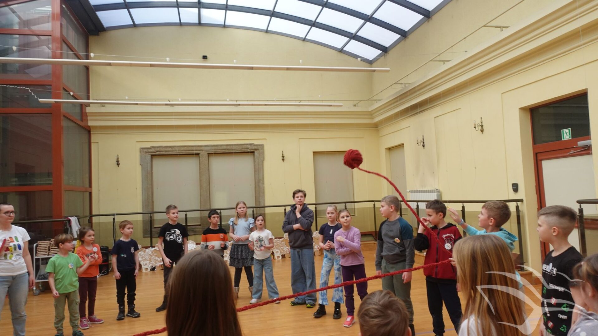 Zawód nie z tej Ziemi… zrobiło się wyjątkowo kolorowo i pachnąco, bo tematem dnia był zawód florysta. Powstawały tiulowe, serduszkowe wianki – było trochę plątania, trochę wiązania i całkiem sporo radosnych okrzyków. Za pomocą chusty, szarf i pyłku wyczarowaliśmy kolorową łąkę.