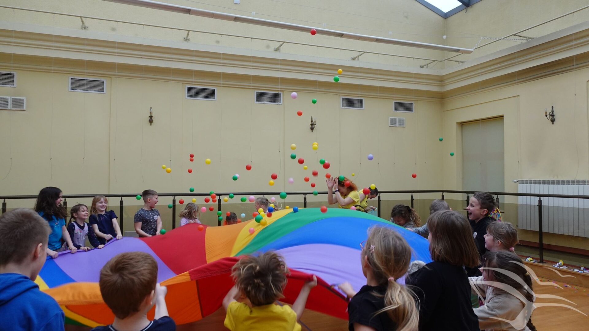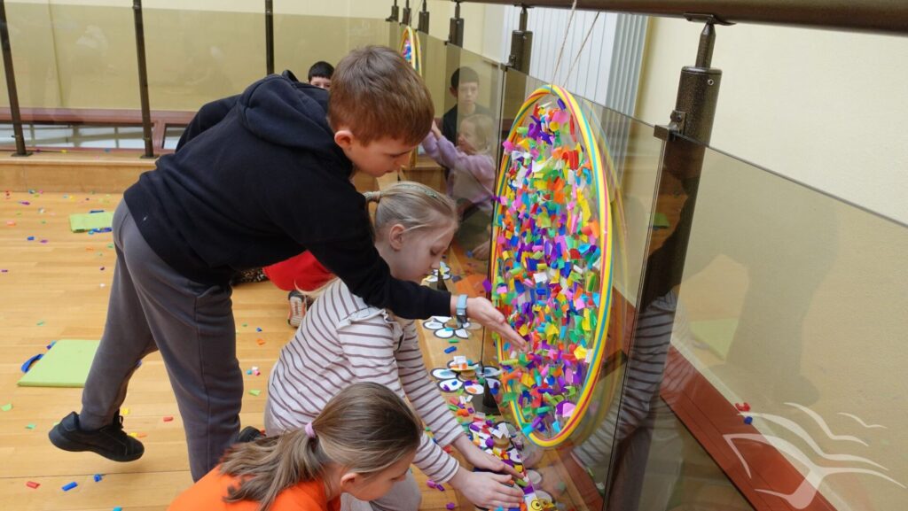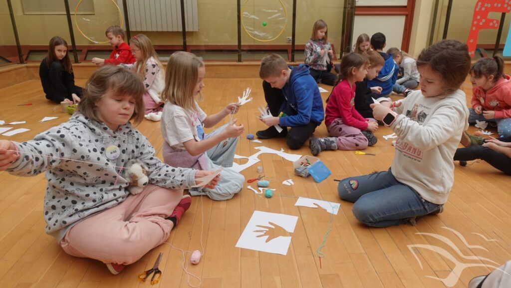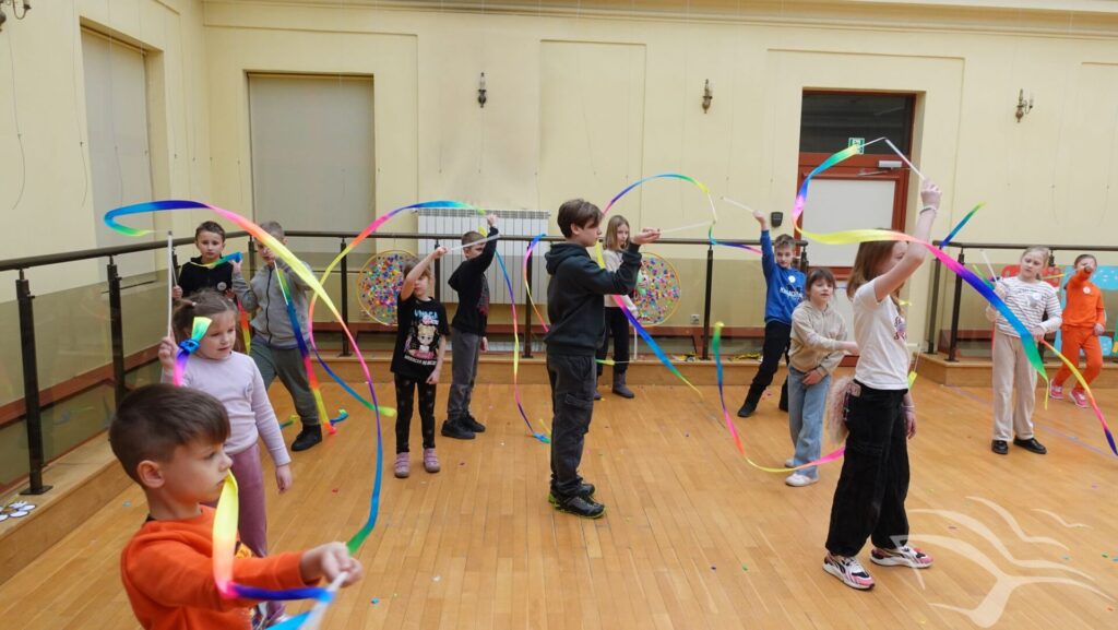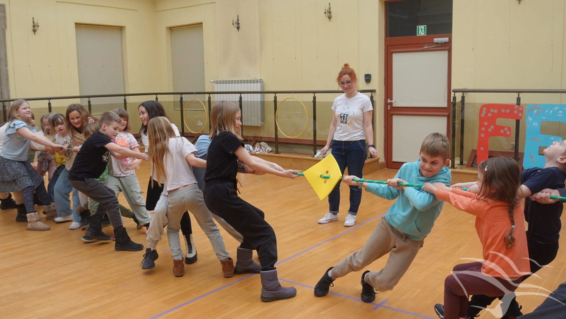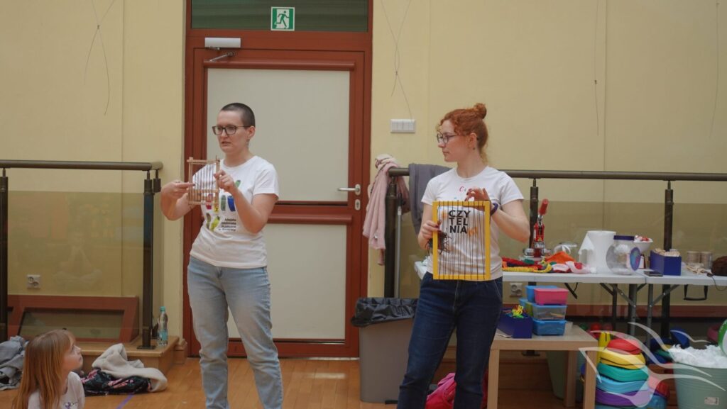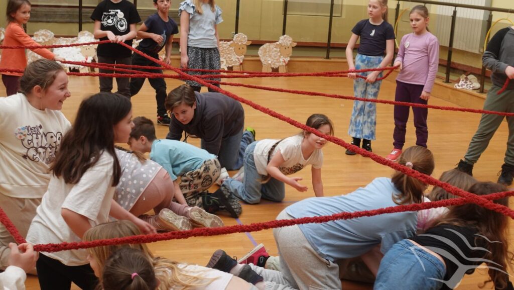 Zawód nie z tej Ziemi… zrobiło się wyjątkowo kolorowo i pachnąco, bo tematem dnia był zawód florysta. Powstawały tiulowe, serduszkowe wianki – było trochę plątania, trochę wiązania i całkiem sporo radosnych okrzyków. Za pomocą chusty, szarf i pyłku wyczarowaliśmy kolorową łąkę.
