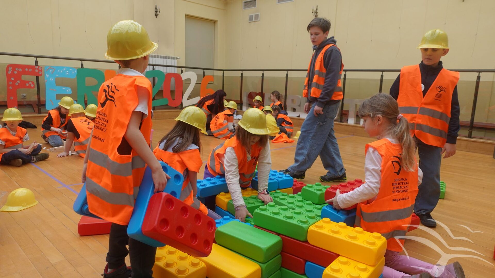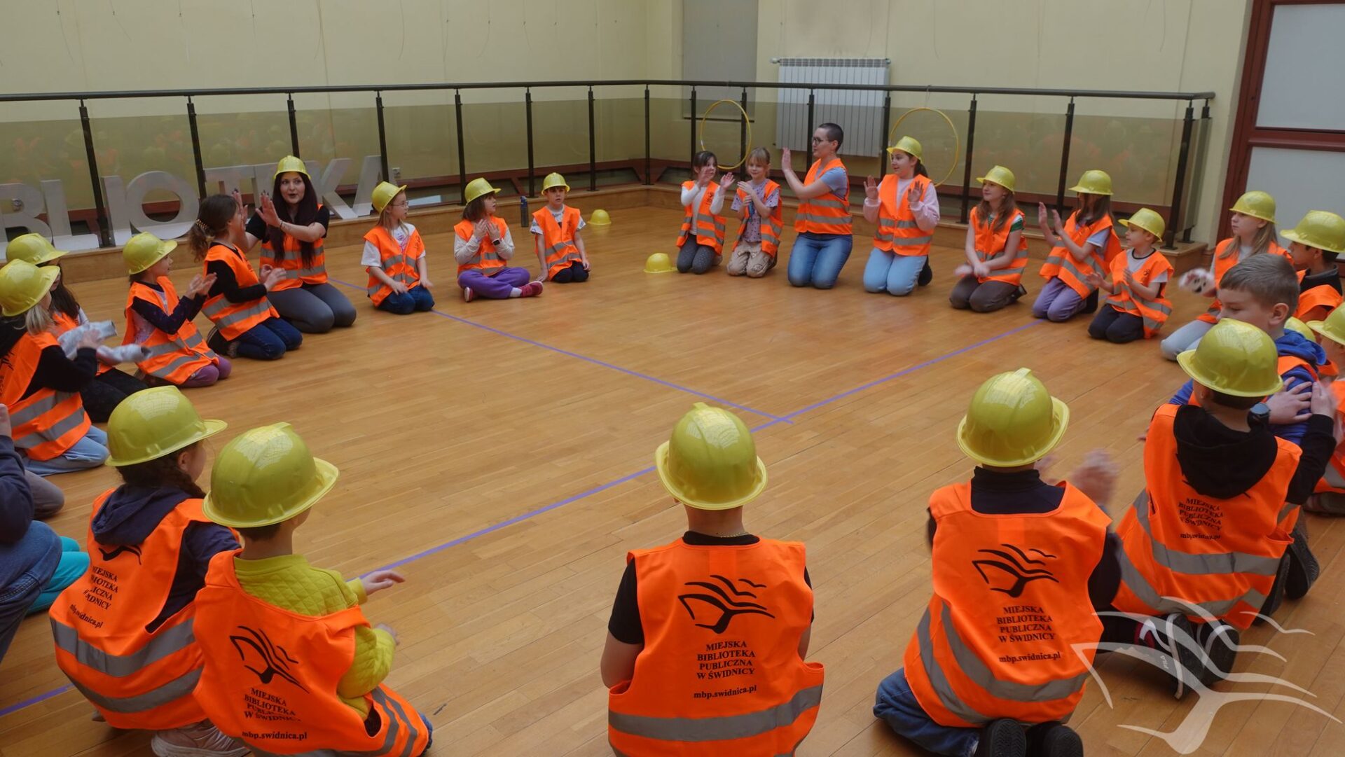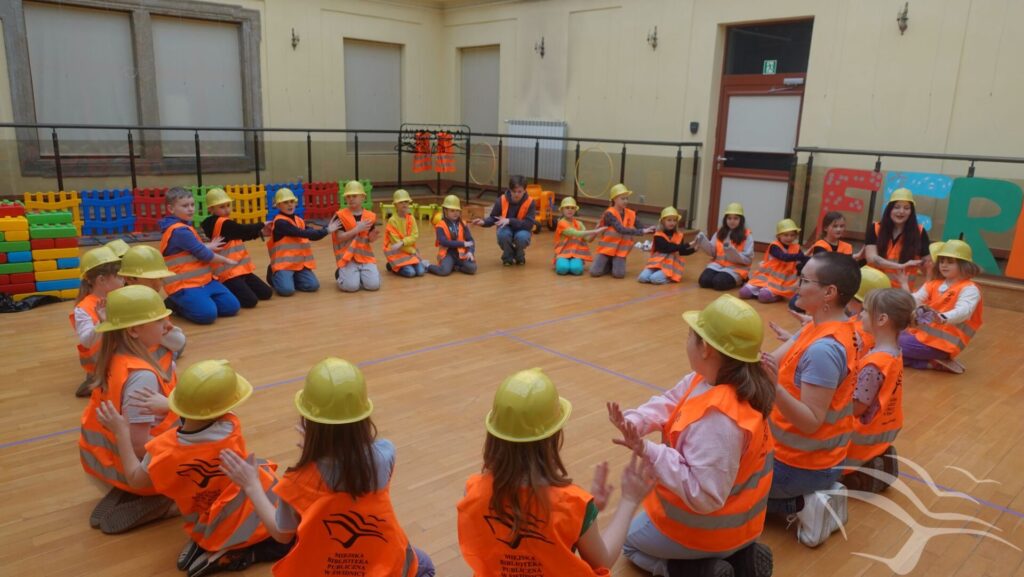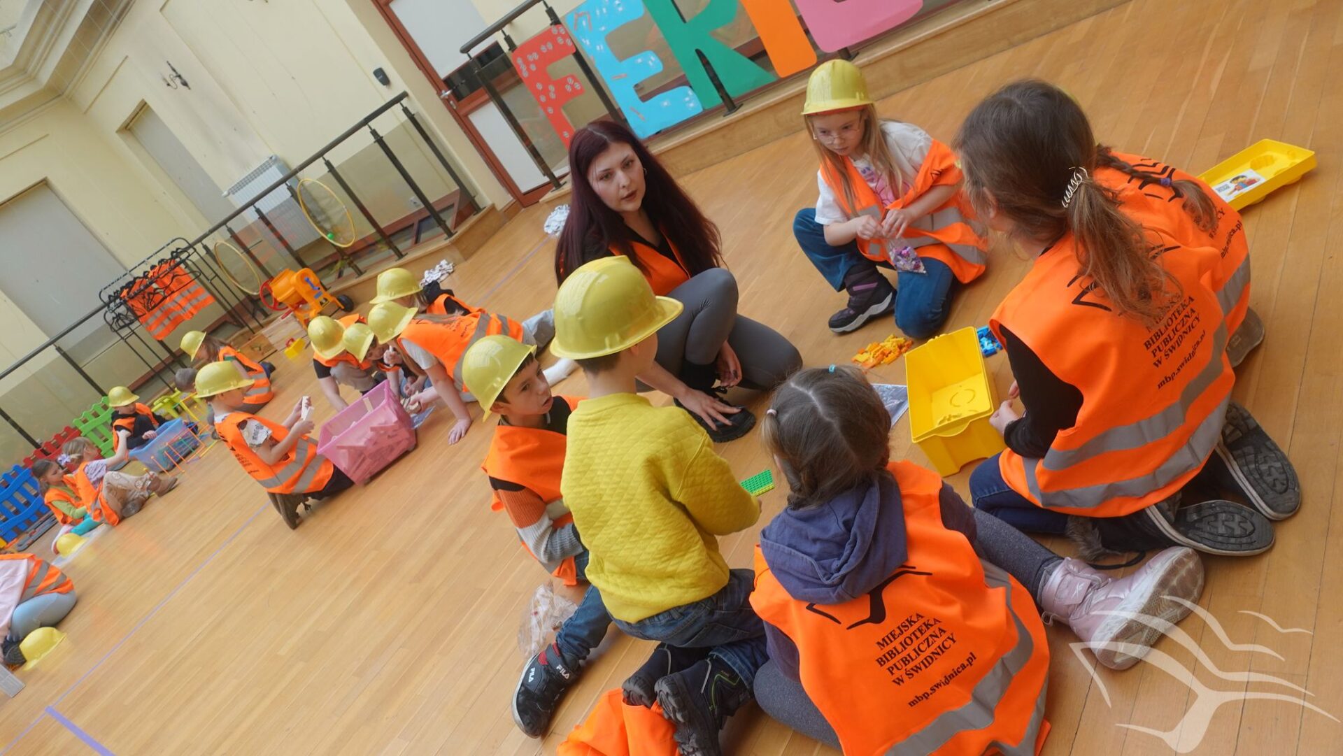 Zawód nie z tej Ziemi… Tematem przewodnim dzisiejszego dnia był budowlaniec, a biblioteka zamieniła się w prawdziwy plac budowy. Dzieci wcieliły się w rolę małych konstruktorów, poznając tajniki pracy na budowie oraz narzędzia niezbędne w tym zawodzie. Wspólne zabawy, zagadki i prace plastyczne pozwoliły uczestnikom stworzyć własne projekty znanych świdnickich budowli.