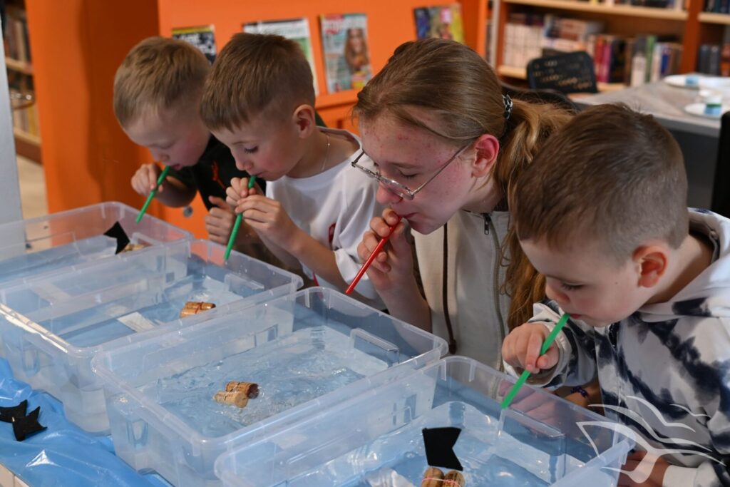 W kolejnej części spotkania odbyła się zabawa w statki. Uczestnicy rywalizowali, kto jako pierwszy, dmuchając przez słomkę, doprowadzi swój papierowy statek do mety na wodzie. Nie zabrakło także „przeszkadzaczy”, którzy machając kartkami tworzyli wiatr wiejący w przeciwną stronę, utrudniając zadanie zawodnikom.