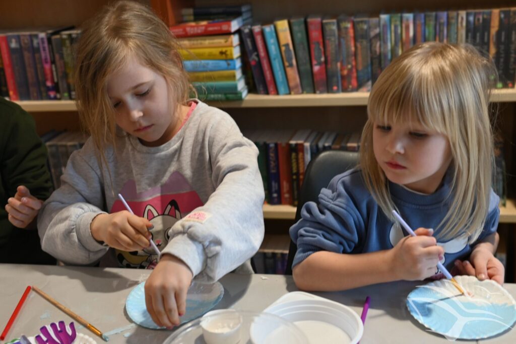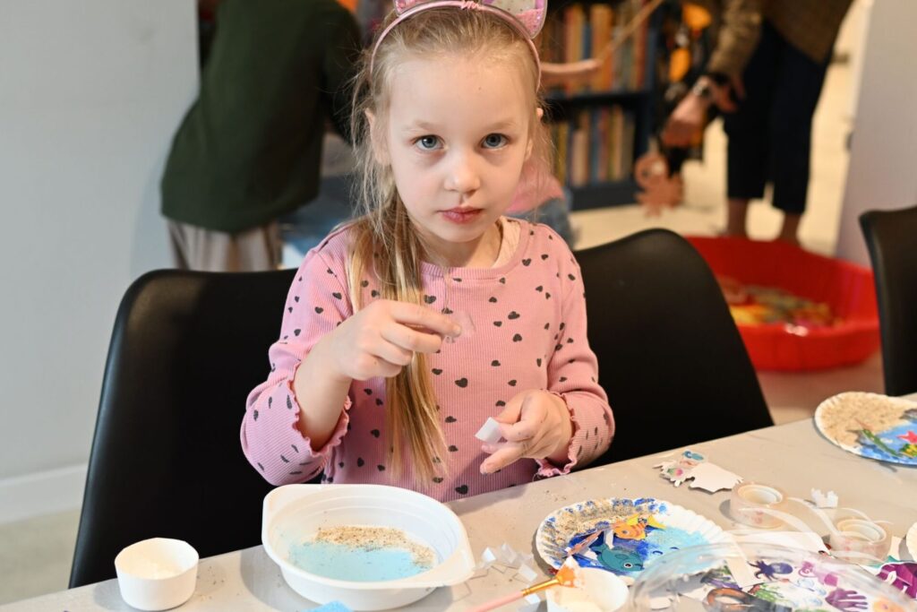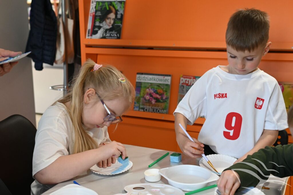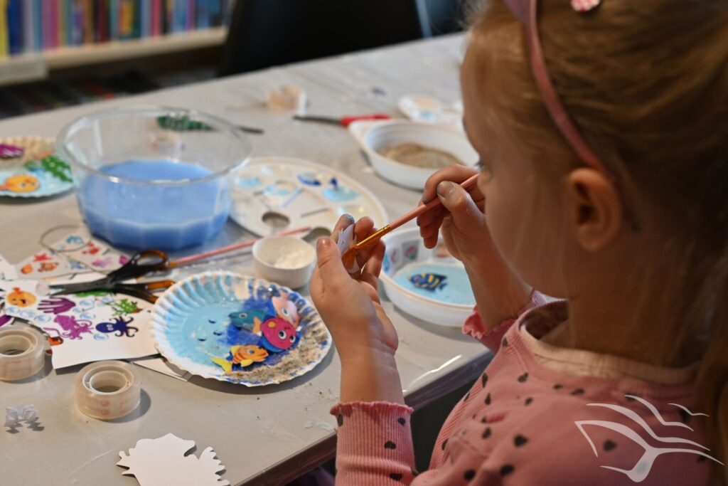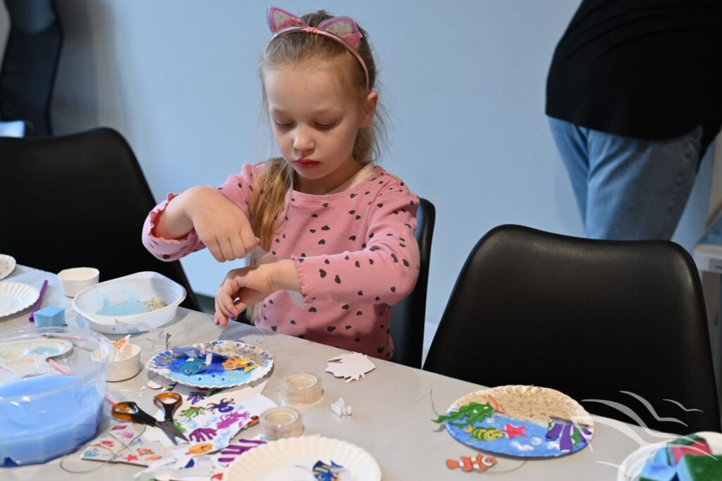 Na zakończenie zajęć przyszedł czas na działania artystyczne. Dzieci wykonały kolorowe akwaria z papierowych talerzyków, wykorzystując farby oraz różnorodne dodatki plastyczne.
