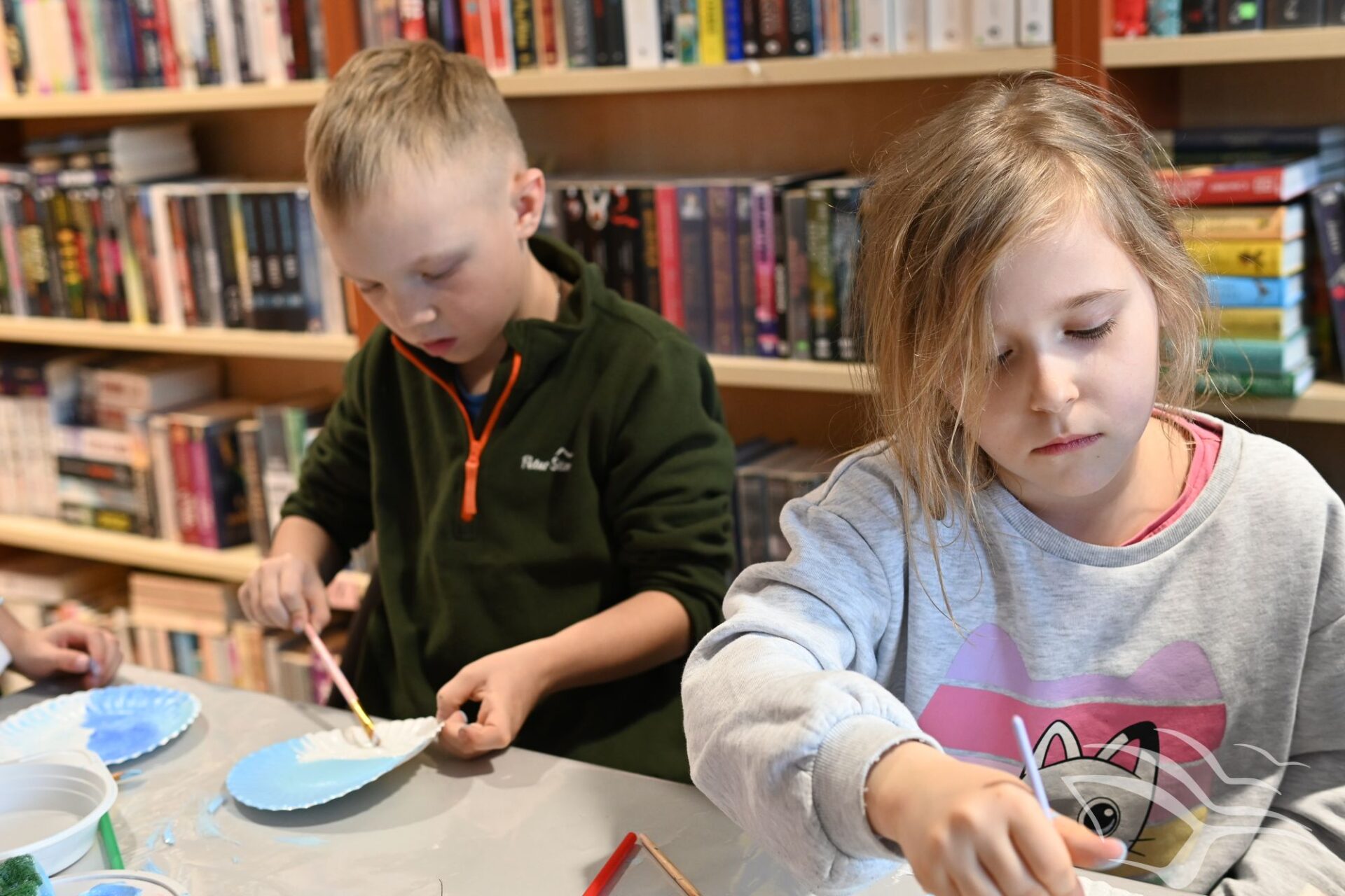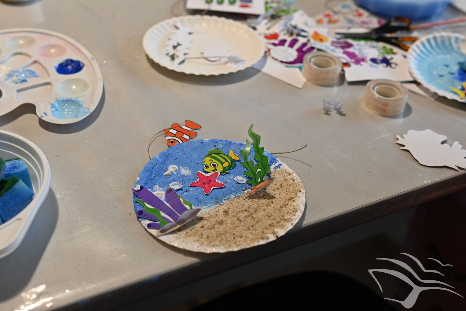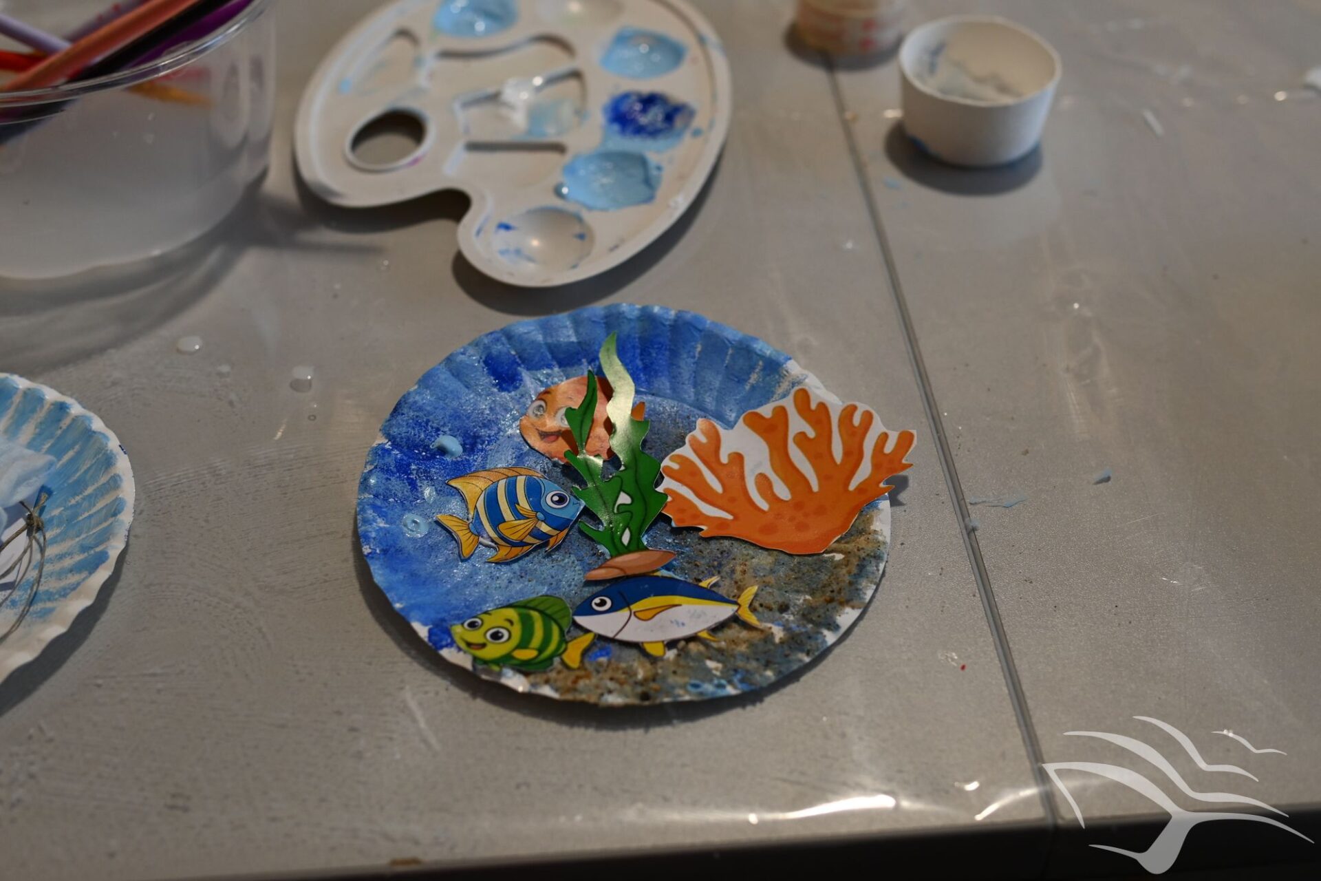 Na zakończenie zajęć przyszedł czas na działania artystyczne. Dzieci wykonały kolorowe akwaria z papierowych talerzyków, wykorzystując farby oraz różnorodne dodatki plastyczne.