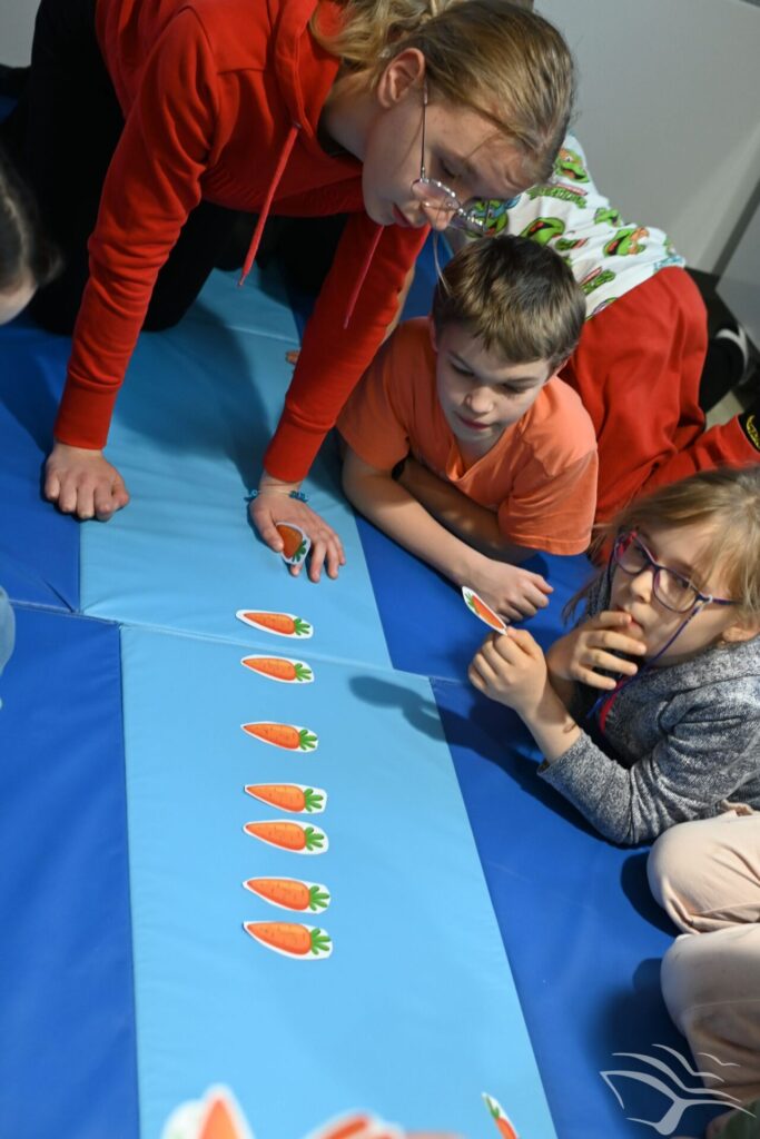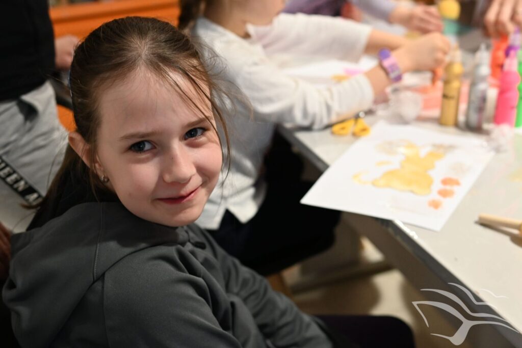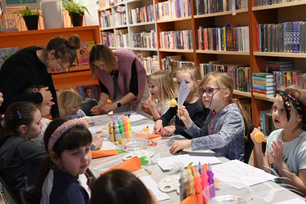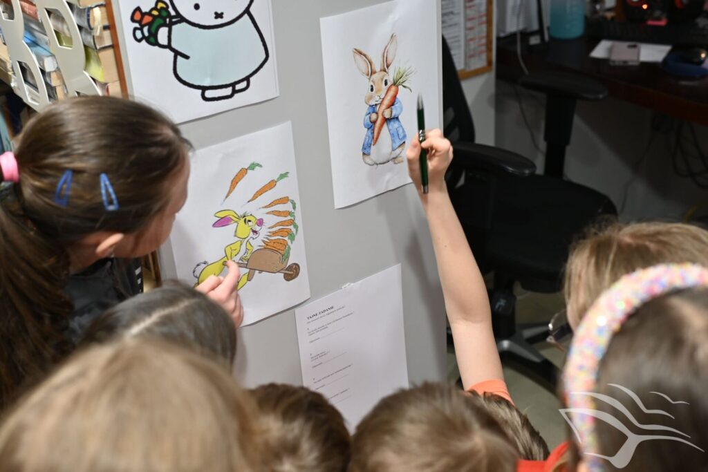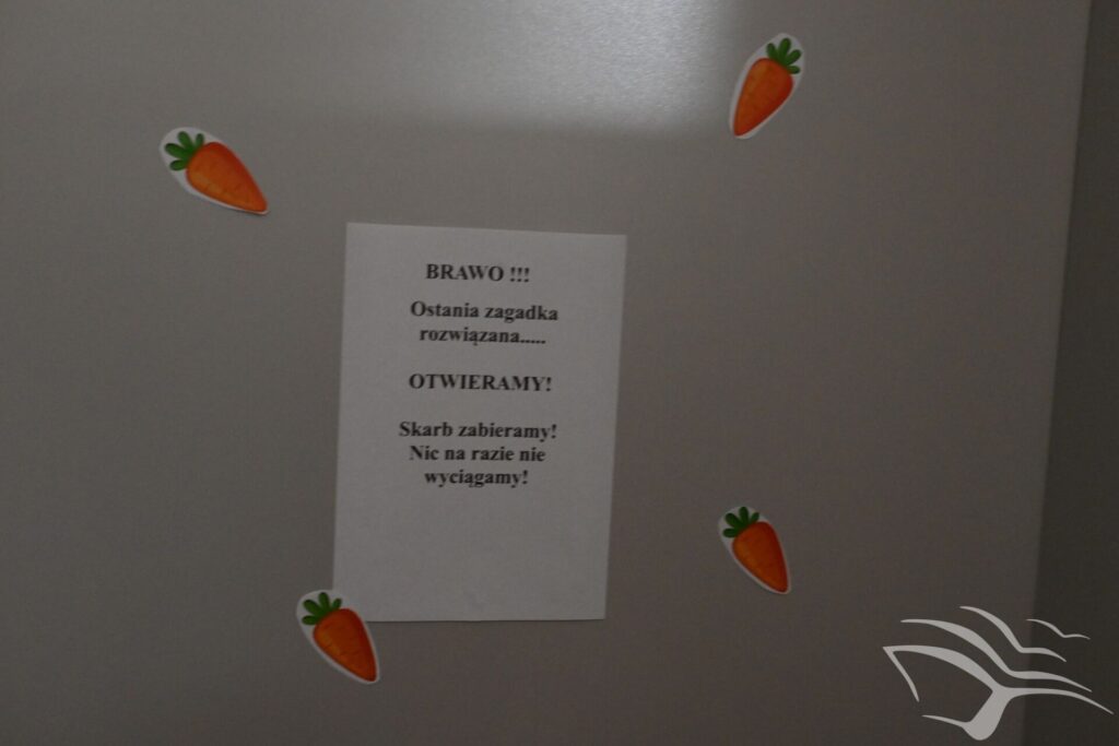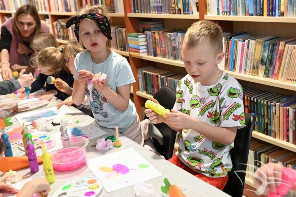 Następnie dzieci wcieliły się w rolę detektywów: szukały ukrytych tropów i rozwiązywały zagadki, które doprowadziły je do odnalezienia skarbu. Na zakończenie zajęć uczestnicy stworzyli własne, kolorowe króliki, wykorzystując farby i różnorodne materiały plastyczne.