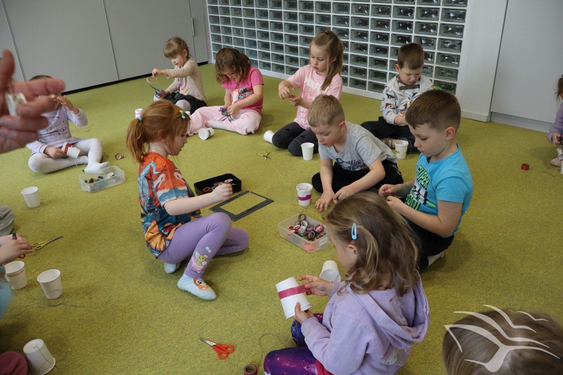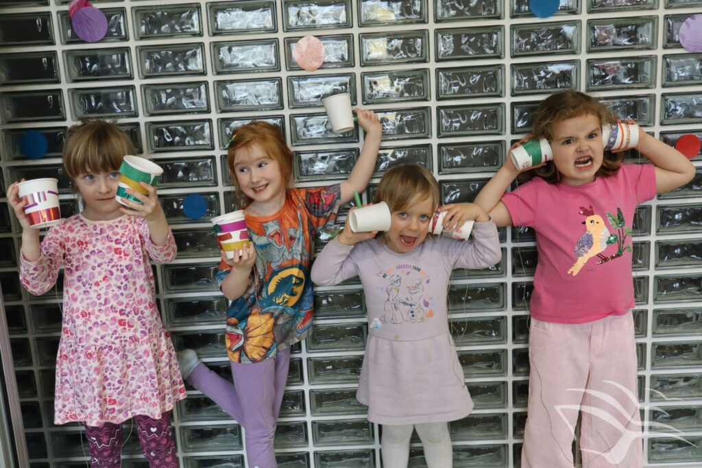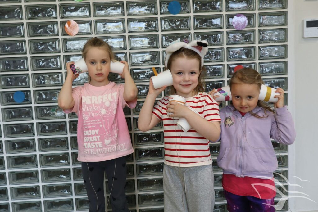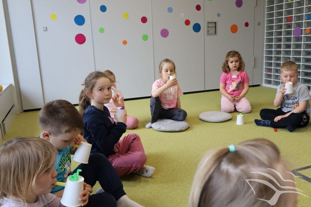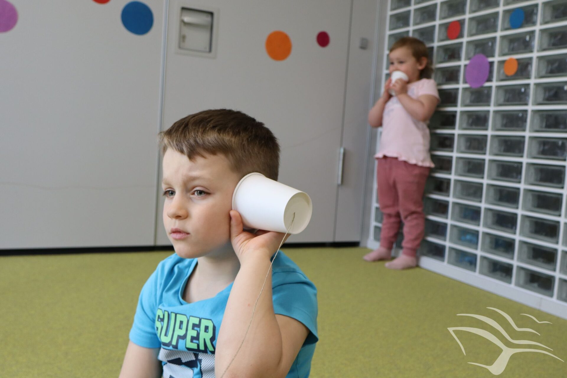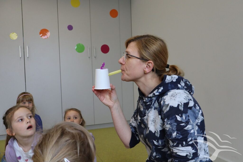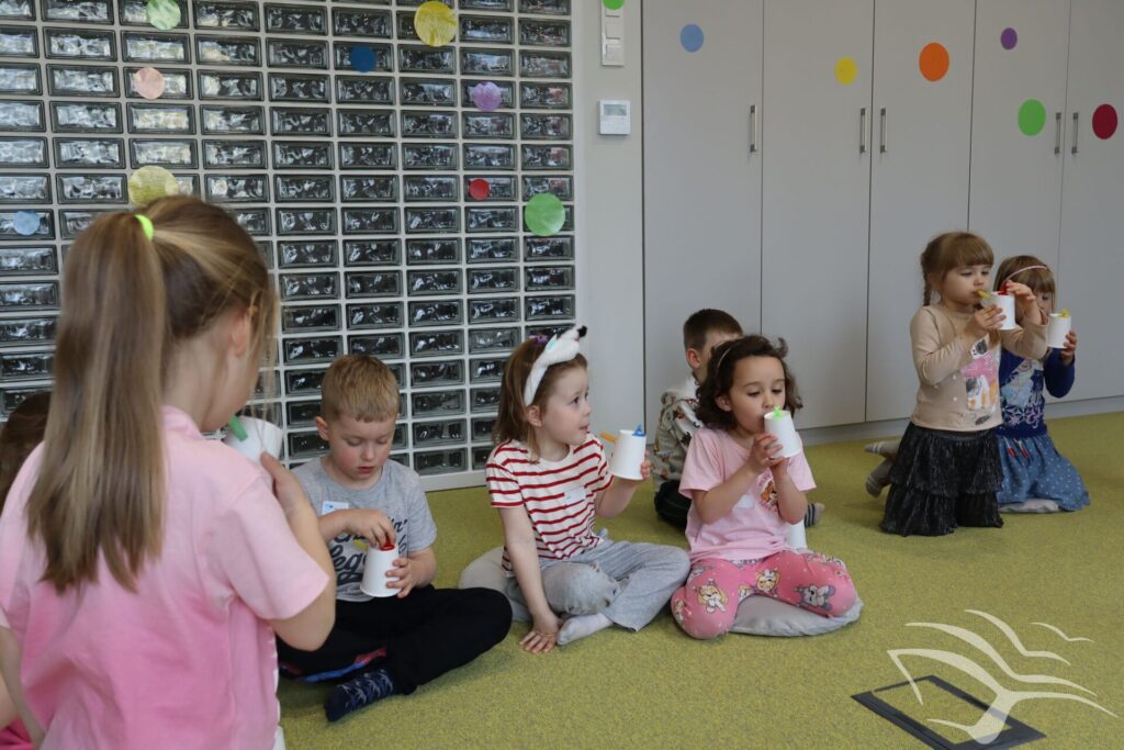 Bajka „Gekon, który odkrył echo” wprowadziła nas w pozytywny nastrój, który pomógł nam w zadaniach dźwiękowych i muzycznych. Wydawaliśmy odgłosy zwierząt, wystukiwaliśmy melodię bum bum rurkami i śpiewaliśmy. Do tego nauczyliśmy się rozmawiać przez telefony z kubków, które później ochoczo ozdabialiśmy. Pobudzaliśmy również dźwiękiem własnych ust węże na kubku. Zabawy i śmiechu było co nie miara.