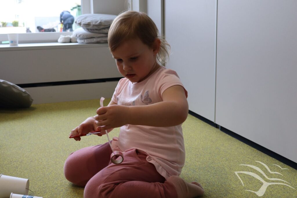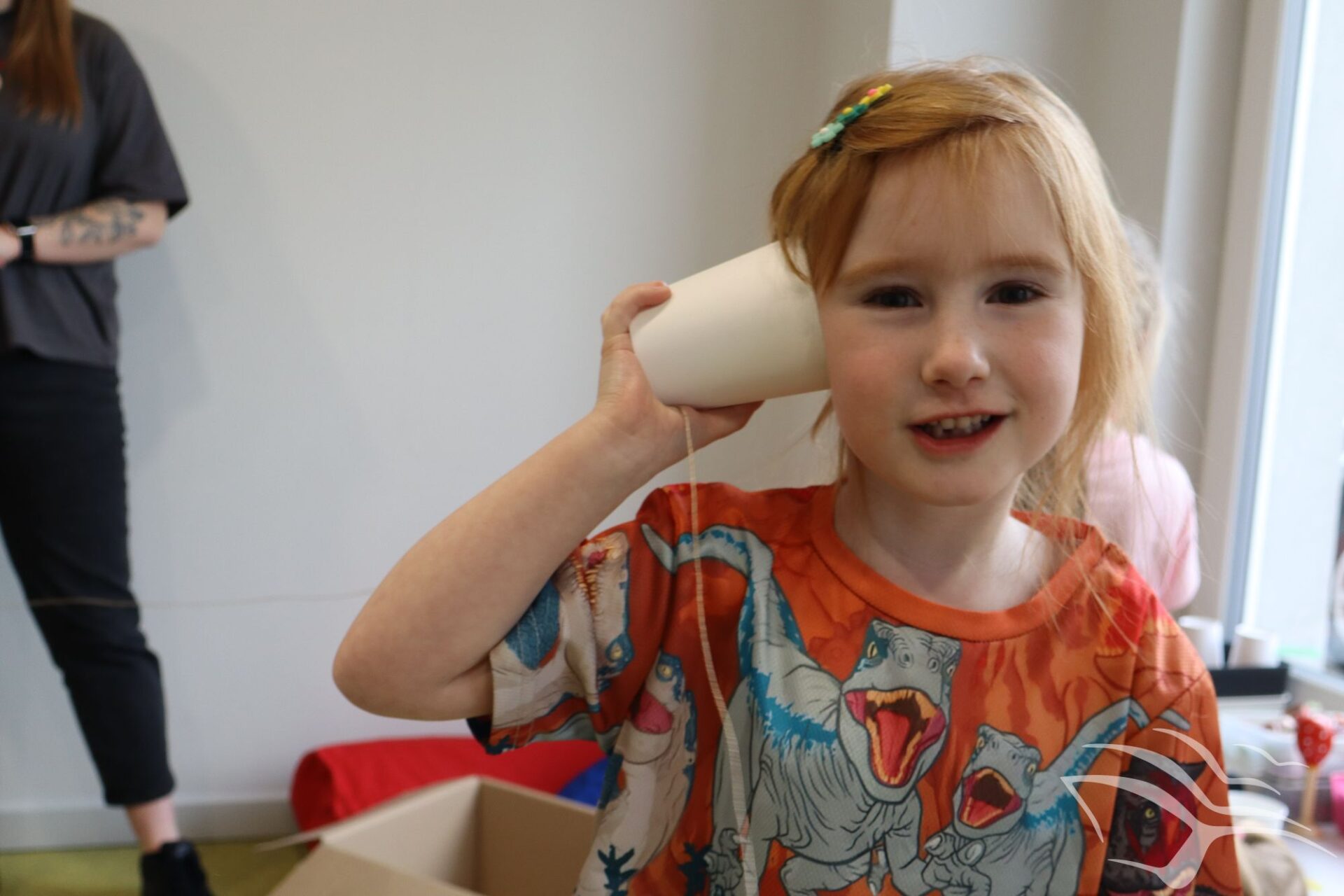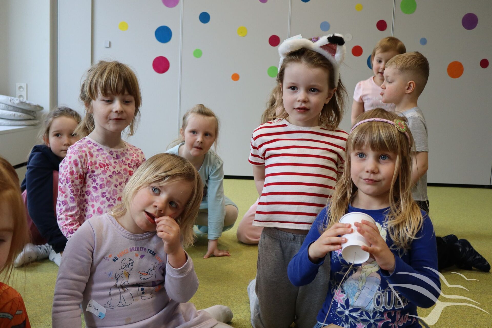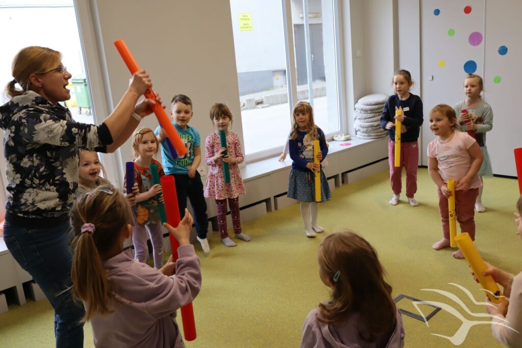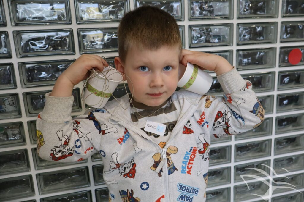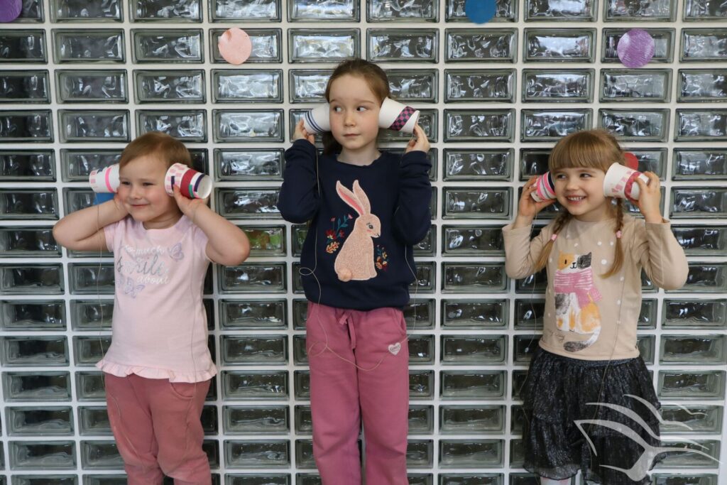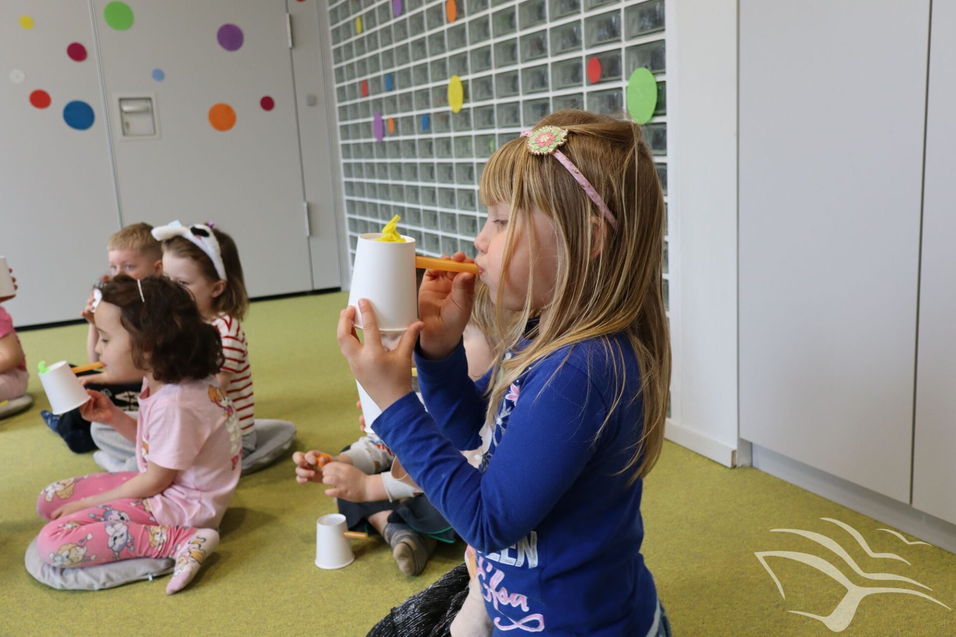 Bajka „Gekon, który odkrył echo” wprowadziła nas w pozytywny nastrój, który pomógł nam w zadaniach dźwiękowych i muzycznych. Wydawaliśmy odgłosy zwierząt, wystukiwaliśmy melodię bum bum rurkami i śpiewaliśmy. Do tego nauczyliśmy się rozmawiać przez telefony z kubków, które później ochoczo ozdabialiśmy. Pobudzaliśmy również dźwiękiem własnych ust węże na kubku. Zabawy i śmiechu było co nie miara.